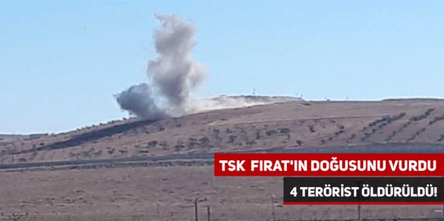Güvenlik kaynaklarından alınan bilgiye göre, Türk Silahlı Kuvvetleri unsurları, Şanlıurfa’nın Suruç ilçesi sınır hattından, Fırat’ın doğusundaki Ayn el Arap (Kobani) bölgesinde bulunan terör örgütü PYD/PKK mevzilerini obüs bataryalarıyla ateş altına aldı. Top atışlarıyla vurulan mevzilerdeki PYD/PKK’lı 4 terörist etkisiz hale getirildi, 6 terörist yaralandı.