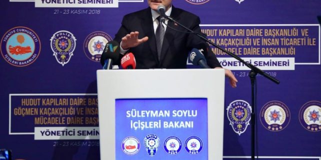 2000 yılında dünyada 20.1 milyon kişi sığınmacı ve mülteci statüsündeyken, bu rakamın 2017 yılı itibarıyla 71,4 milyon kişi olduğunu söyleyen Soylu, BM verilerine göre son 20 yıldaki artış hızıyla giderse, bu rakamın 2050 yılında ise 405 milyon kişi olarak hesaplandığını belirtti. Bu rakamların sınır güvenliği ve hudut meselesinde karmaşık bir hal aldığını ifade eden Soylu, hacim artışı, neticesinde ’sınır yönetimi’ diye bir kavramın ortaya çıktığını ifade etti. Geçişi engellemekle mükellef olunan yabancı terörist savaşçılar (YTS) konusunda bilgi veren Soylu, “Elbette ki yabancı terörist savaşçılar dediğimiz ve hudut kapılarında, havaalanı ve otogarlarda TEM ve istihbarat birimlerimiz 27 bin şahsı kontrol etmiş, çatışma bölgelerine geçme arayışında olduğu değerlendirilen 8 bin 526’sının ülkemize girişi engellenmiş, bin 331’i de geldikleri ülkelere geri gönderilmek üzere geri gönderme merkezlerine teslim edilmiştir. Keza yönetmek zorunda olduğumuz göç meselesi var. Bunun içinde uluslararası koruma başvurusuyla gelenler olduğu gibi bir de yasadışı göç var ve bunun bir güvenlik boyutu var. Frontex 2018 risk analiz raporuna göre AB’nin tamamında sınır dışı kararı verilen 279 bin 215 kişiden sadece 151 bin 398’i sınır dışı edilebilmiştir. Yani, neredeyse yarısı kadar. Oysa Türkiye sadece 2018 yılının ilk on ayında sınır dışı sayısı 49 bin 523’tür. Tek başımıza AB’nin sınır dışı ettiğinin üçte biri kadar bir sayıya ulaştık. Yakaladığımız toplam düzensiz göçmen sayısı 234 bin 443’tür. Bunun içinde denizlerde yakalananlar, göç idaresine teslim edilenler dahildir. Bunların 162 bin 738’i ise kolluk birimleri tarafından adli işleme tabi tutulanlardır. Organizatör sayısı ise en son güncel rakam olarak 4 bin 948’dir” diye konuştu.