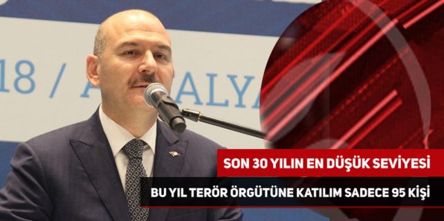 Antalya’da turizmcilerle bir araya gelen İçişleri Bakanı Süleyman Soylu, terörle çok ciddi adımlar attıklarını ifade ederek, “Bu yıl terör örgütüne katılım sadece 95 kişi oldu ve bu rakam son 30 yılın en düşük seviyesidir. 2015’te bu rakam 3 bin 881 kişiydi” dedi.