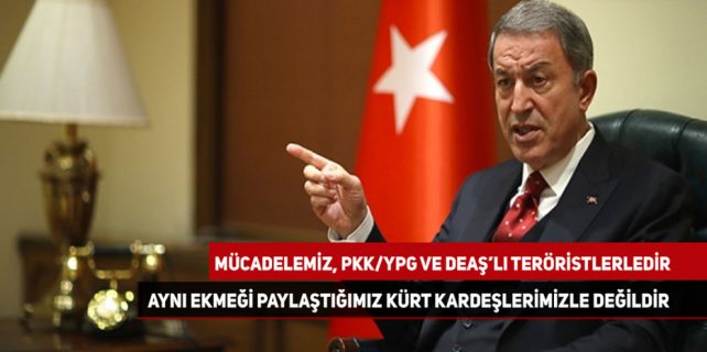Milli Savunma Bakanı Hulusi Akar, “TSK’nın mücadelesi yüzyıllardır aynı coğrafyayı, aynı ekmeği paylaştığımız Kürt kardeşlerimizle değildir. Bizim mücadelemiz, PKK/YPG ve DEAŞ’lı teröristlerledir” dedi.