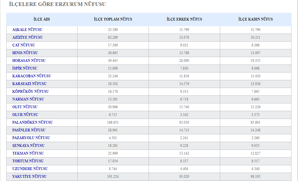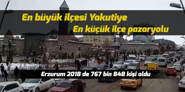 Türkiye’nin nüfusu, 2018’de bir önceki yıla göre 1 milyon 193 bin 357 kişi artarak 82 milyon 3 bin 882 kişi oldu. En kalabalık il sıralamasında ise İstanbul, Ankara ve İzmir geldi.Erzurum´un 2018 yılı nüfusu 767 bin 848 kişi olarak kaydedildi. İl nüfusu 2017 yılına göre binde 9.6 oranındaki artışla 760 bin 476´dan 767 bin 848´e yükseldi.