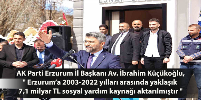 AK Parti Erzurum İl Başkanı Av. İbrahim Küçükoğlu,” Erzurum’a 2003-2022 yılları arasında yaklaşık 7,1 milyar TL sosyal yardım kaynağı aktarılmıştır. ” dedi.
