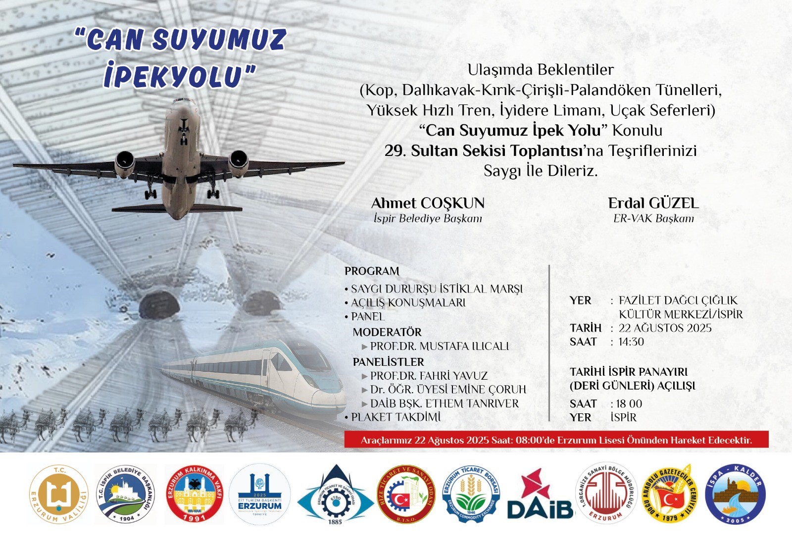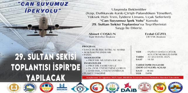 29. Sultan sekisi toplantısı, ulaşımda beklentiler konusuyla ispirde yapılacak.Erzurum Kalkınma Vakfı’nın her yıl geleneksel olarak yapmış olduğu Sultan Sekisi Toplantısı’nda tarihi ipek yolunun eski fonksiyonuna kazandırılması konusu işlenecek.