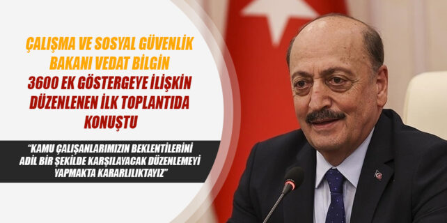 Çalışma ve Sosyal Güvenlik Bakanı Vedat Bilgin, 3600 ek gösterge konusunda gerçekleştirilen ilk toplantıda, “Kamu çalışanlarımızın 3600 ek göstergeyle adil bir şekilde onların beklentilerini karşılayacak bir düzenlemeyi yapacak kararlılıktayız” dedi.