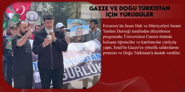 Erzurum’da İnsan Hak ve Hürriyetleri İnsani Yardım Derneği tarafından düzenlenen programda; Üniversitesi Camisi önünde buluşan öğrenciler ve katılımcılar yürüyüş yaptı, İsrail’in Gazze’ye yönelik saldırılarını protesto ve Doğu Türkistan’a destek verdiler.