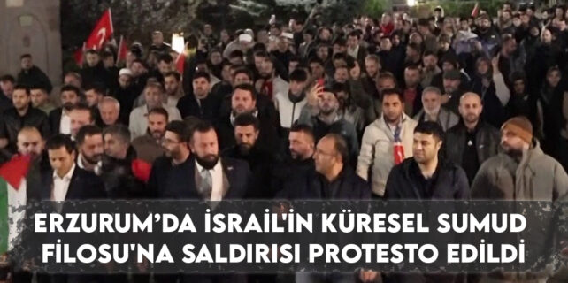 Erzurum’da, ablukayı kırmak ve insani yardım ulaştırmak amacıyla Gazze’ye doğru yol alan küresel Sumud Filosu’na İsrail tarafından yapılan saldırılara tepki gösterildi.