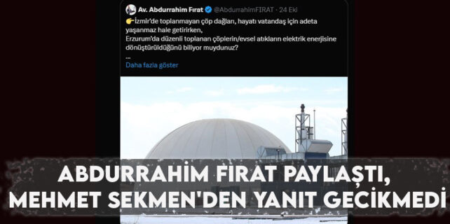 AK Parti Erzurum Milletvekili Abdurrahim Fırat’ın, Erzurum Büyükşehir Belediyesi’nin çöplerden enerji üretme projesine ilişkin yaptığı paylaşım sosyal medyada geniş yankı buldu. Fırat’ın Erzurum ile İzmir’i karşılaştırarak Erzurum’daki çevreci uygulamalara dikkat çektiği paylaşımına, Büyükşehir Belediye Başkanı Mehmet Sekmen’den teşekkür mesajı geldi.