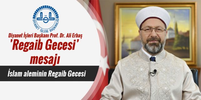Diyanet İşleri Başkanı Prof. Dr. Ali Erbaş, ’’Aziz milletimizin ve bütün İslam aleminin Regaib Gecesi’ni tebrik ediyor, bu gecenin ve mübarek üç ayların Müslümanların birlik ve dirliğine, insanlığın hidayet, barış ve huzuruna vesile olmasını Yüce Allah’tan niyaz ediyorum’’ dedi.