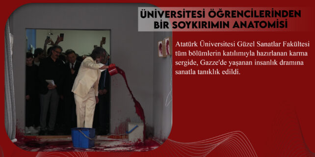 Atatürk Üniversitesi Güzel Sanatlar Fakültesi öğrenci ve hocaların katkılarıyla önemli iki etkinliğe imza atıldı. Gazze: Bir Soykırımın Anatomisi etkinliğe Gazze’deki insanlık ayıbına dikkat çekilmek istenirken, Erzurum Temalı Karma Sergisi ile şehrin kültürel ve doğal zenginliklerine sanatla bakmayı hedefledi. Açılışta Güzel Sanatlar Fakültesi Sahne Sanatları Bölümü Öğretim Görevlisi Dr. Selim Cinisli’nin, yere serdiği beyaz örtü üzerine kırmızı boya serperek “Sahiplenilmeyen İzler” konulu senografik performans sergiledi. Atatürk Üniversitesi Rektör Yardımcısı Prof. Dr. Hasan Yılmaz, üniversitelerin topluma bilgi sunan, araştırma yapılan özellikle de güncel olaylara vurguda bulunan yerler olduğunu ifade ederek, “Çok değerli öğrencilerimizin değerli eserlerini gördük. Tiyatral bir gösteri ile Filistin’de olan zulümlere değerli öğrencilerimiz ortaya koymaya çalıştılar. Aynı şekilde sunmuş oldukları eserlerle umutlarımızın tükenmediğini bize göstermeye çalıştılar. Biz bu sergiyi gördükten sonra toplumumuzun bu duyarlılığını görünce genç arkadaşlarımızla geleceğe daha umutla bakmayı öğrendik” dedi.