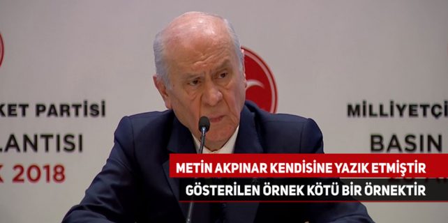 MHP Genel Başkanı Devlet Bahçeli, Metin Akpınar’ın sözlerine ilişkin, “Bu eleştiri değildir, Metin Akpınar hem kendisine hem demokrasiye yazık etmiştir hem de gösterilen örnek kötü bir örnektir” dedi. Bahçeli, Akpınar’ın özür dilemesi gerektiğini ifade etti.