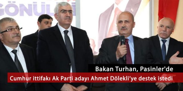 Bakan Turhan, “17 yıllık iktidarda ülkemize olduğu gibi Erzurum ve ilçelerine hizmeti getiren iktidar partisi “Memleket İşi Gönül İşi” sloganıyla hizmetleri sizlere sunmaktan başka bir derdi ve davası yoktur. Cumhurbaşkanımız Recep Tayyip Erdoğan’ın bu ülke için yaptıklarının en yakın şahidi sizlersiniz. Ülke olarak zor günlerden geçildiğini belirten Turhan, bu seçimler beka seçimidir. Ülkemize karşı saldırıların biri bitiyor biri başlıyor. Onun için gün Cumhurbaşkanımıza ve Ahmet Dölekli kardeşimize sahip çıkma zamanıdır. Ak Parti gönüllerin ve gönüllülerin partisidir. Hizmet aşkı duyanlar bugün saflarını Ak Parti ve Ak Dava’ya gönül verdikleri için bir taşın üstüne taş koyuyor. Pasinler’de üç mahalli dönemdir Ak Parti’ye oy verdiniz. Bu dönemde ben inanıyorum ki yine sandıklardan Ak Parti zaferle ile ayrılacaktır.” dedi.