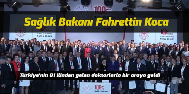 Türkiye’nin 81 ilinden gelen doktorlarla bir araya gelen Sağlık Bakanı Fahrettin Koca, doktorundan hasta bakıcısına kadar, sağlık hizmetinin her aşamada sabır ve fedakarlık istediğini ifade ederek “Gece gündüz demeden çalışan, bu kutsal mesleği büyük fedakarlıklarla yerine getiren, mesleğine aşkla bağlı, saygın, onurlu meslektaşlarımın 14 Mart Tıp Bayramı’nı yürekten kutlarım. 14 Mart’ı sadece bir gün, bayram olarak kutlamak yerine, tüm sağlık çalışanlarımızı kucaklıyor ve bu haftayı ‘Sağlık Haftası’ olarak kutluyoruz. Bu yıl Tıp Bayramı kutlamalarının 100. yılı olması münasebetiyle özel bir önem taşımaktadır’’ dedi.