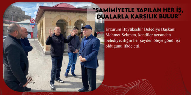 Başkan Sekmen, eski Hacı Cuma Mahallesi’nde vatandaşlarla bir araya geldiklerini ifade ederek, “Mahalle mahalle geziyor, hemşehrilerimizin sesine kulak veriyoruz. Taleplerini dinledik, devam eden hizmetlerimizi yerinde inceledik, yapılması gereken çalışmaları istişare ettik. Bizim için belediyecilik sadece altyapı, üstyapı çalışması değildir. Bizim işimiz gönül işi. Yol da yapsak, kaldırım da, park da; önce gönüllere dokunmak isteriz. Çünkü biliyoruz ki samimiyetle yapılan her iş, dualarla karşılık bulur. Erzurum’un her bir mahallesinde alın terimiz, her bir hanesinde muhabbetimiz olsun istiyoruz. Derdimiz hizmet, sevdamız Erzurum. Allah’ın izniyle, gece gündüz demeden bu güzel şehir için çalışmaya devam edeceğiz” şeklinde konuştu.