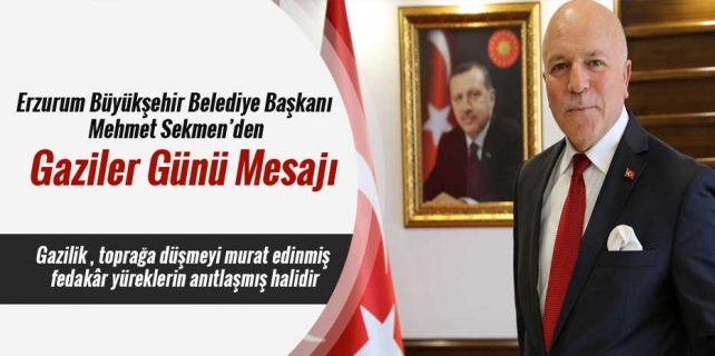 Erzurum Büyükşehir Belediye Başkanı Mehmet Sekmen, 19 Eylül Gaziler Günü dolayısıyla yazılı bir kutlama mesajı yayınladı. Başkan Sekmen mesajında; Şehitlik ve Gazilik makamlarını milli ve manevi hayata vurulan birer mühür diye tarif ederek, “Şehitlik nasıl ki vatan uğruna can vermeyi canına minnet saymaksa, Gazilik de, toprağa düşmeyi murat edinmiş fedakâr yüreklerin anıtlaşmış halidir. Gazilik, bu bağlamda yerine getirilmiş kutsi bir görev ve aynı zamanda milletimizin paha biçilemez değerlerinden birisidir” ifadelerini kullandı.