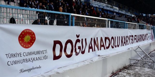 Maçta tribünlere asılan, 08-09 Mart tarihlerinde Cumhurbaşkanlığı İnsan Kaynakları Ofisi himayelerinde Erzurum Recep Tayyip Erdoğan Fuar Merkezi’nde düzenlenecek, Doğu Anadolu Kariyer Fuarı pankartı dikkat çekti.