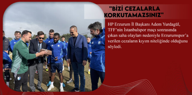 MHP İl Başkanı Yurdagül yaptığı açıklamada, “Bugün sevdamız Erzurumspor’umuz için büyük bir kıyımın haberini derin bir üzüntüyle öğrendik. Geçtiğimiz günlerde oynanan ve kulübümüzün resmen haklarının hiçe sayıldığı İstanbulspor maçı sonrası çıkan olaylar sebebiyle TFF’nin açıkladığı cezalar resmen bir futbol kulübünün ve camiasının kıyımıyla sonuçlanmıştır” dedi.