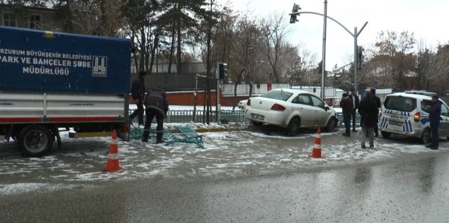 Erzurum’da gece saatlerinden itibaren etkili olan kar yağışı ile birlikte bir otomobil buzlanan zeminde kayarak refüje çıktı.