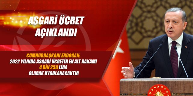 CUMHURBAŞKANI RECEP TAYYİP ERDOĞAN, 2022 YILINDA UYGULANACAK ASGARİ ÜCRET MİKTARININ 4 BİN 250 TL OLACAĞINI AÇIKLADI.
