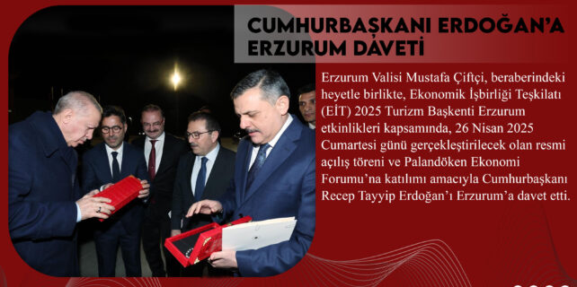 Erzurum Valisi Mustafa Çiftçi, beraberindeki heyetle birlikte, Ekonomik İşbirliği Teşkilatı (EİT) 2025 Turizm Başkenti Erzurum etkinlikleri kapsamında, 26 Nisan 2025 Cumartesi günü gerçekleştirilecek olan resmi açılış töreni ve Palandöken Ekonomi Forumu’na katılımı amacıyla Cumhurbaşkanı Recep Tayyip Erdoğan’ı Erzurum’a davet etti.