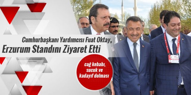 Cumhurbaşkanı Yardımcısı Fuat Oktay ile beraberindekiler daha sonra Erzurum standını ziyaret ederek, Erzurum Ticaret Borsası Yönetim Kurulu Başkanı Hakan Oral’dan Erzurum cağ kebabı ve kadayıf dolması hakkında bilgiler aldı. Bu arada Başkan Yardımcısı Fuat Oktay ve beraberindekilere Erzurum cağ kebabı, sucuk ve kadayıf dolması ikram edildi.