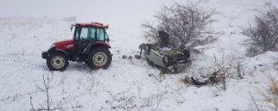 ERZURUM’UN AŞKALE İLÇESİNDE KARLI ZEMİNDE KAYAN OTOMOBİL ŞARAMPOLE UÇTU. KAZADA SÜRÜCÜ YARALANDI