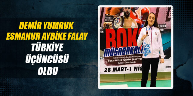 Balıkesir’de yapılan Üniversitelerarası Türkiye Bayanlar Boks Şampiyonasında 63 kilo sıkletinde Esmanur Aybike Falay Türkiye üçüncüsü oldu.