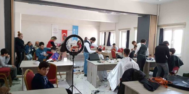 Hizmet İçi Eğitim Enstitüsünde ağırlaman depremzede vatandaşların saç ve sakal kesimleri, gönüllü berber ve kuaförler tarafindan ücretsiz olarak yapıldı.