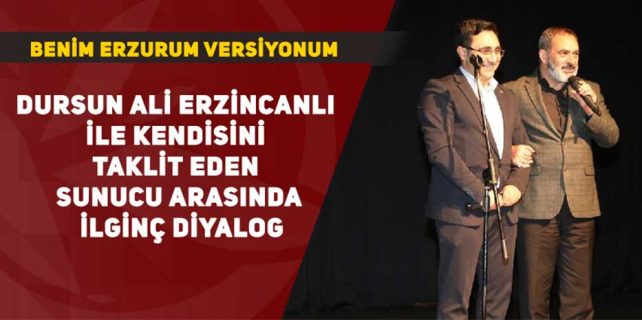 Erzurum Büyükşehir Belediyesinin düzenlediği “Maddeden Manaya” programına katılmak üzere Erzurum’da sahne alan ünlü şair Dursun Ali Erzincanlı’nın sahnede taklidini yapan sunucu Abdullah Çelik arasındaki diyalog dinleyenleri kahkahaya boğdu.