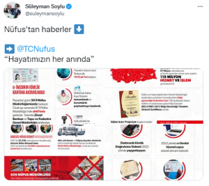 İçişleri Bakanı Süleyman Soylu, Twitter hesabından Nüfus ve Vatandaşlık İşleri Genel Müdürlüğünün hizmetlerine ilişkin çeşitli bilgilerin yer aldığı görselleri “Nüfustan Haberler” başlığıyla paylaştı.