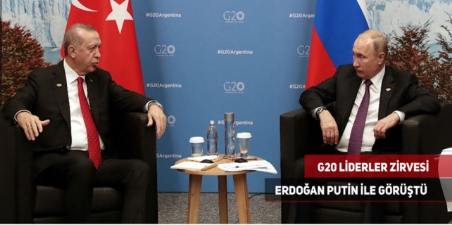 Arjantin’inde düzenlenen G20 Liderler Zirvesi’ne katılmak üzere başkent Buenos Aires’te bulunan Cumhurbaşkanı Recep Tayyip Erdoğan, Rusya Devlet Başkanı Vladimir Putin ile görüştü. Yapılan heyetler arası görüşmede Cumhurbaşkanı Erdoğan’a Cumhurbaşkanlığı Sözcüsü İbrahim Kalın, Dışişleri Bakanı Mevlüt Çavuşoğlu, Hazine ve Maliye Bakanı Berat Albayrak ve Ticaret Bakanı Ruhsar Pekcan eşlik etti.