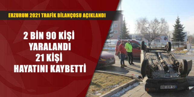Erzurum’da 2021 yılında 21 kişi trafik kazalarında yaşamını yitirdi. İlde 2021 yılı toplamında meydana gelen ölüm ve yaralanmalı trafik kazası sayısı Doğu Anadolu Bölgesi toplamında yüzde 12.42, ülke toplamında ise yüzde 0,64’lük oran oluşturdu.