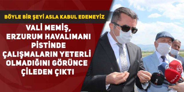 Erzurum Valisi Okay Memiş ve beraberindekiler, Erzurum Havalimanı’nda devam eden Kategori 3A (CAT-3A) sistemi çalışmalarını inceledi. Vali Memiş, çalışmaların yeterli olmadığını görünce çileden çıktı. Çalışmaları yapan yüklenici firma yetkililerine sert tepki gösteren Vali Memiş, “Bu işi bitiremezsen ben vali olarak bu ilde görev yapamam. Utançtan sokağa çıkamayız, böyle bir şeyi asla kabul edemeyiz” dedi.