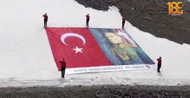 Kuruluşunun 184’üncü yılına özel olarak Erzurum İl Jandarma Komutanlığı personeli Palandöken Dağı zirvesinde üzerinde ‘Kanun Ordusu Jandarma 184 yaşında’ yazılı dev Türk Bayrağı ve Mustafa Kemal Atatürk’ün posterini açtı.