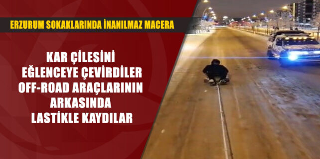 ERZURUM’DA ETKİLİ OLAN KAR YAĞIŞININ TADINI MACERA SEVERLER ÇIKARTTI. OFF-ROAD ARAÇLARININ ARKASINA BAĞLADIKLARI LASTİĞİN ÜZERİNE OTURAN VATANDAŞLAR KEYİFLİ DAKİKALAR YAŞADI.