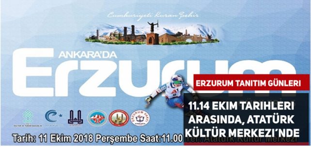 Bu yıl Ankara’da 6.’sı düzenlenen Erzurum Tanıtım Günleri, T.C. Kültür ve Turizm Bakanlığı, Erzurum Valiliği, Erzurum Büyükşehir Belediyesi, Erzurum Dernekler Federasyonunun yüklenici organizasyonun da, ESAV Vakfı, Ankara ERVAK’ ın destekleriyle yapılacak.