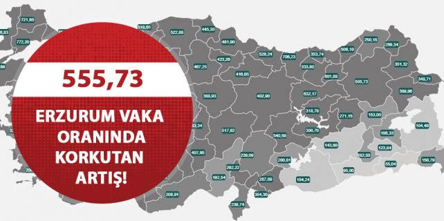 Erzurum’da her yüz binde 8 – 14 Şubat tarihleri arasında 37.71; 14 – 21 Şubat arasında 50.90; 20 -26 şubat aralığında 43.30, 27 Şubat – 5 Mart aralığında 52,22; 6 Mart – 12 Mart aralığında 45.63; 13 – 19 Mart aralığında 72.4, 20 – 26 Mart aralığında 118,95, 27 Mart – 2 Nisan aralığında 245.16, 2 Nisan – 9 Nisan aralığında yüz binde 369.78, 10 -16 Nisan 493.09 olan her yüz bin kişideki vaka sayısının 555.73’e çıktığı açıklandı.