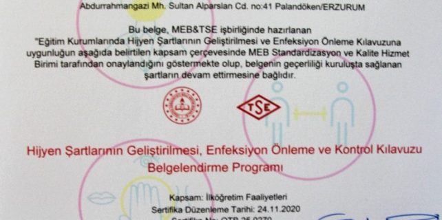Milli Eğitim Bakanlığı ile Sanayi ve Teknoloji Bakanlığı arasında imzalanan “Eğitim Kurumlarında Hijyen Şartlarının Geliştirilmesi ve Enfeksiyonu Önleme İş Birliği Protokolü” kapsamında pandemi döneminde tüm okullarda uygulanması koşulu ile TSE (Türk Standartları Enstitüsü) tarafından bir standart geliştirildi. Bu standart Erzurum’da da tüm okullarda uygulanmaya başladı.