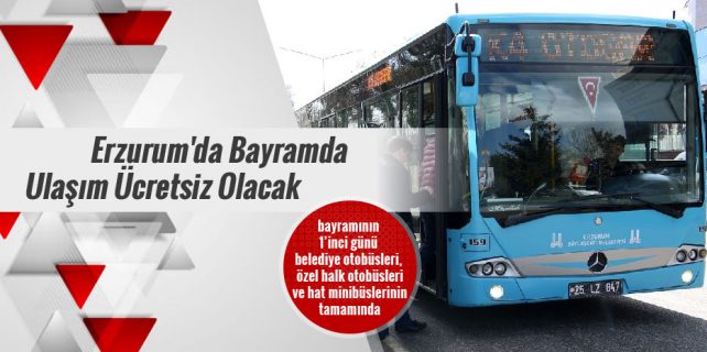 ERZURUM BÜYÜKŞEHİR BELEDİYESİ’NİN BAYRAMLARA ÖZEL ÜCRETSİZ ULAŞIM GELENEĞİ YİNE BOZULMADI. ERZURUM’DA KURBAN BAYRAMININ 1’İNCİ GÜNÜ BELEDİYE OTOBÜSLERİ, ÖZEL HALK OTOBÜSLERİ VE HAT MİNİBÜSLERİNİN TAMAMINDA ULAŞIM ÜCRETSİZ OLACAK.