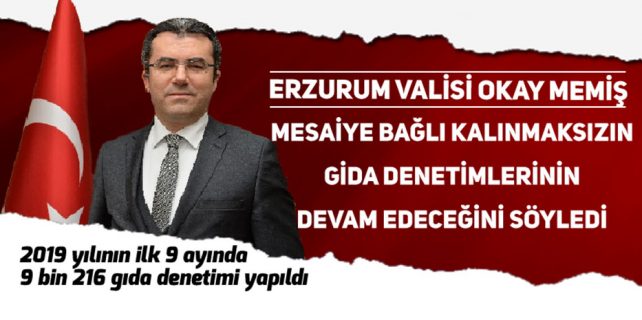 Erzurum’da toplu tüketim ve üretim yerlerine yönelik 2018 yılında 13 bin 660, 2019 yılının ilk 9 ayında ise 9 bin 216 gıda denetimi yapıldı. Amaçlarının vatandaşların güvenilir ve sağlıklı gıdaya ulaşmasını sağlamak olduğunu dile getiren Vali Okay Memiş, insan sağlığını korumak adına mesaiye bağlı kalınmaksızın gıda denetimlerinin devam edeceğini söyledi.