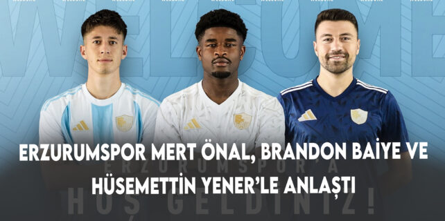 Erzurumspor FK tarafından yeni transferlerle ilgili yapılan açıklamada, “Transfer çalışmalarını sürdüren Erzurumsporumuz, Mert Önal, Brandon Baiye ve Hüsemettin Yener’le anlaşma sağladı. Takımımız, son olarak Boluspor forması giyen santrafor oyuncusu Hüsamettin Yener’le 1 yıllık, Turğutluspor’dan orta saha oyuncusu Mert Önal’la 3 yıllık ve Belçika Ligi takımlarında Eupen forması giyen orta saha oyuncusu Brandon Baiye ile 2 yıllık resmi sözleşme imzaladı. Kulüp Başkanımız Sayın Ahmet Dal’la, Erzurumspor tesislerimizde son görüşmelerini gerçekleştiren oyuncularımız, takımımızın kampına katıldı. Yeni transferlerimize hoş geldiniz diyor, Erzurumspor camiamız altında başarılar diliyoruz” denildi.