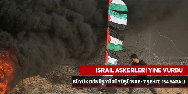 İsrail askerlerinin, abluka altındaki Gazze sınırında düzenlenen barışçıl ‘Büyük Dönüş Yürüyüşü’nde, göstericilere açtığı ateş sonucu 7 Filistinli yaşamını yitirdi, 154 kişi yaralandı.