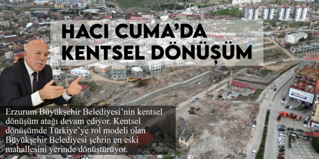 Hacı Cuma Mahallesi’nde konut ve işyeri yapan Büyükşehir Belediyesi bölgede 239 konut, 20 ofis ve 216 ticari alan inşa edecek. Erzurum Büyükşehir Belediye Başkanı Mehmet Sekmen, konuyla ilgili yaptığı değerlendirmede, kentin en önemli kentsel dönüşüm atağının Hacı Cuma Mahallesi’nde gerçekleştirildiğini kaydetti. Başkan Sekmen, konuyla ilgili şunları kaydetti: ” Bölgede toplam 239 konut, 96 araç kapasiteli otopark, 20 ofis ve 216 ticari alan yapılacak. 89 bin 450 metrekarelik alanı kapsayan Hacı Cuma Mahallesi’nde 56 bin 150 metrekarelik alanda da peyzaj ve çevreyle ilgili rekreasyon çalışmaları gerçekleştirilecek.”