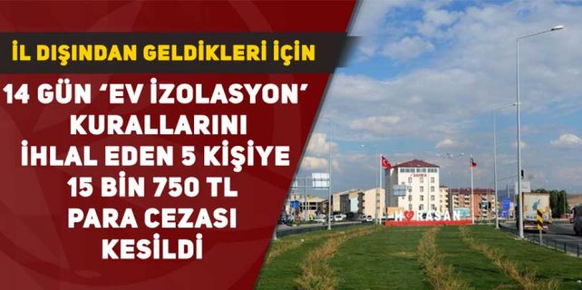Erzurum’da il dışından Horasan ilçesine gelerek korona virüsle mücadele kapsamında 14 gün ‘ev izolasyon’ kurallarını ihlal eden 5 kişi 15 bin 750 TL para cezasına çaptırıldı.