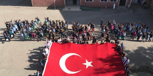 Türk Silahlı Kuvvetleri’nce Fırat’ın doğusunda terör örgütü PKK ve YPG’ye yönelik başlatılan Barış Pınarı Harekatı’nda görev yapan Mehmetçiğe destekler sürüyor. Horasanda İnkılap İlkokulu öğrencileri, öğretmenleriyle birlikte okul bahçesinde Mehmetçiğe destek olmak için bir araya geldi. Öğrenciler Türk bayrağı açarak, harekatta görev alan askerler için dua ederek selam gönderdi. Sosyal medyada yayınlanan görüntüler büyük ilgi gördü.