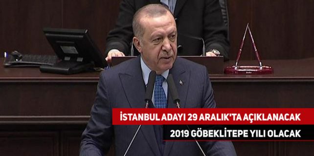 Partisinin TBMM’de düzenlenen grup toplantısı sonrası gazetecilerin sorularını yanıtlayan Cumhurbaşkanı Recep Tayyip Erdoğan, AK Parti’nin İstanbul Büyükşehir Belediye Başkan adayının 29 Aralık tarihinde açıklanacağını duyurdu. Erdoğan ayrıca Türkiye Büyük Millet Meclisi (TBMM) Başkanı Binali Yıldırım’ın adaylık için istifa etmesine gerek olmadığını söyledi. Aynı görüşü bir süre önce MHP Genel Başkanı Devlet Bahçeli de dile getirmişti.