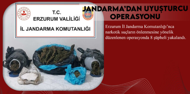 Erzurum İl Jandarma Komutanlığı’nca narkotik suçların önlenmesine yönelik düzenlenen operasyonda 8 şüpheli yakalandı.