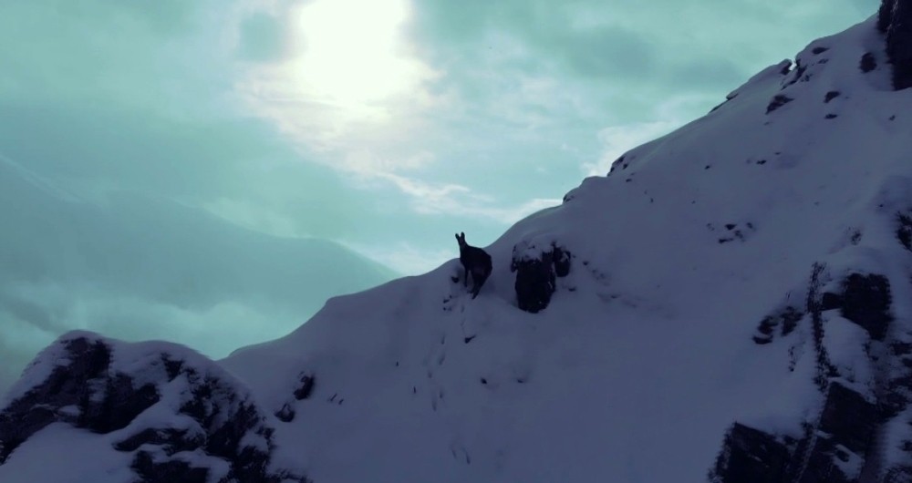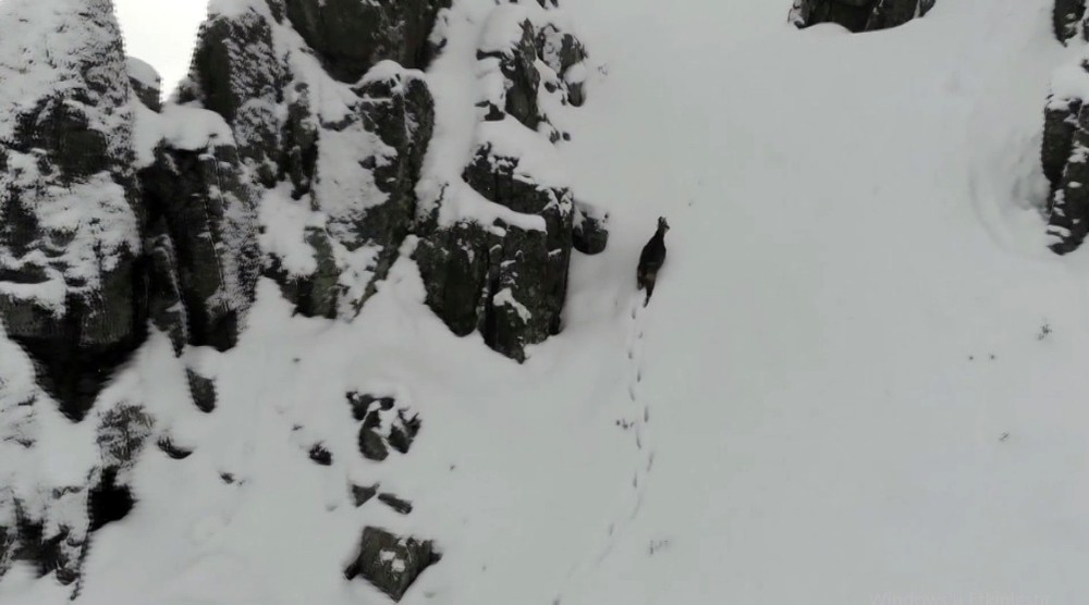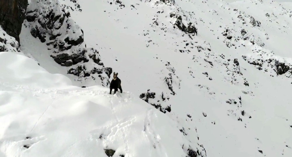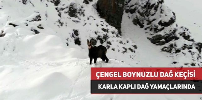 ERZURUM’DA KARLA KAPLI DAĞIN YAMAÇLARINDA YALNIZ BAŞINA DOLAŞAN ÇENGEL BOYNUZLU DAĞ KEÇİSİ GÖRÜNTÜLENDİ.
