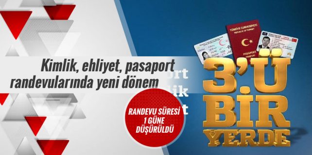 İçişleri Bakanlığınca geçtiğimiz yıl Nisan ayında başlatılan, “3’ü Bir Yerde” uygulaması kapsamında bugüne kadar 19 milyon 95 bin 662 yeni kimlik, 4 milyon 402 bin 703 sürücü belgesi, 2 milyon 251 bin 214 adet pasaport basıldı. Nüfus müdürlüklerinde artırılan kapasite ve personel sayısı randevu alma sürelerini kısalttı. Daha önce yoğunluktan dolayı 61 güne kadar uzayan randevu süreleri 1 güne düşürüldü. Yeni dönemde kimlik, ehliyet, pasaport almak için başvuranlar, başvurduğu günde randevu alabilecek.