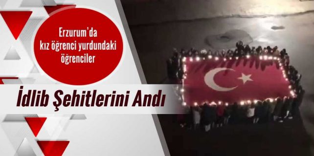Erzurum’da kız öğrenci yurdundaki öğrenciler Suriye’nin İdlib kentinden rejim güçlerinin askeri konvoya saldırısı sonrası şehit düşen 36 askeri, dev Türk Bayrağı açarak andı.
