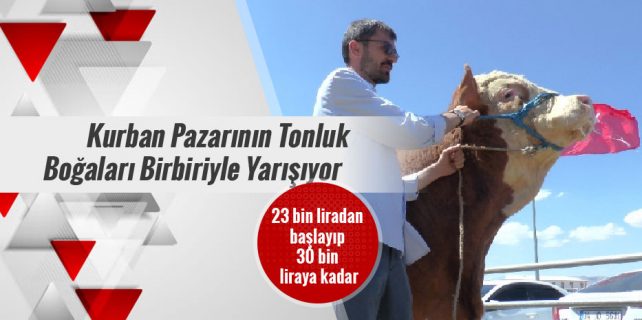 Erzurum canlı hayvan pazarında 1 tonun üzerindeki kurbanlık boğalar fiyatlarıyla birbiriyle yarışıyor. Araba fiyatına olan kurbanlıklar 23 bin liradan başlayıp 30 bin liraya kadar alıcı buluyor.